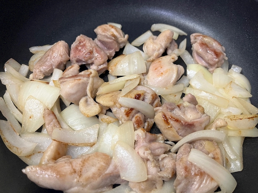 中火で鶏もも肉、玉ねぎを