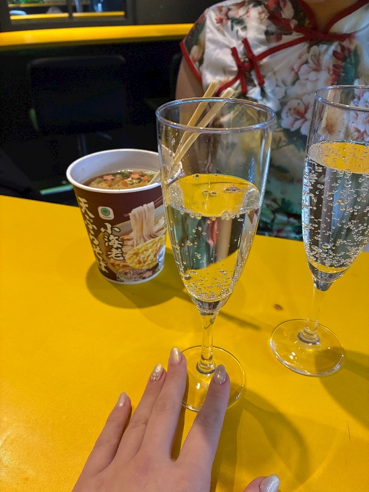 カップ麺と並んでるシャンメリーが