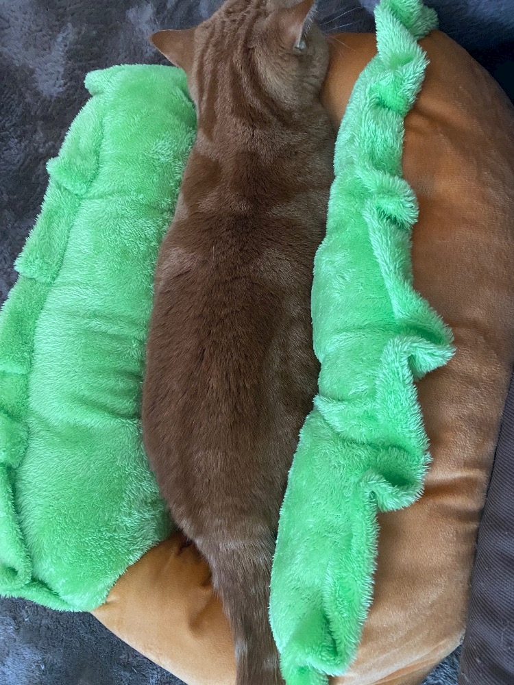 ホットドック型のクッションに挟まってるんだよー