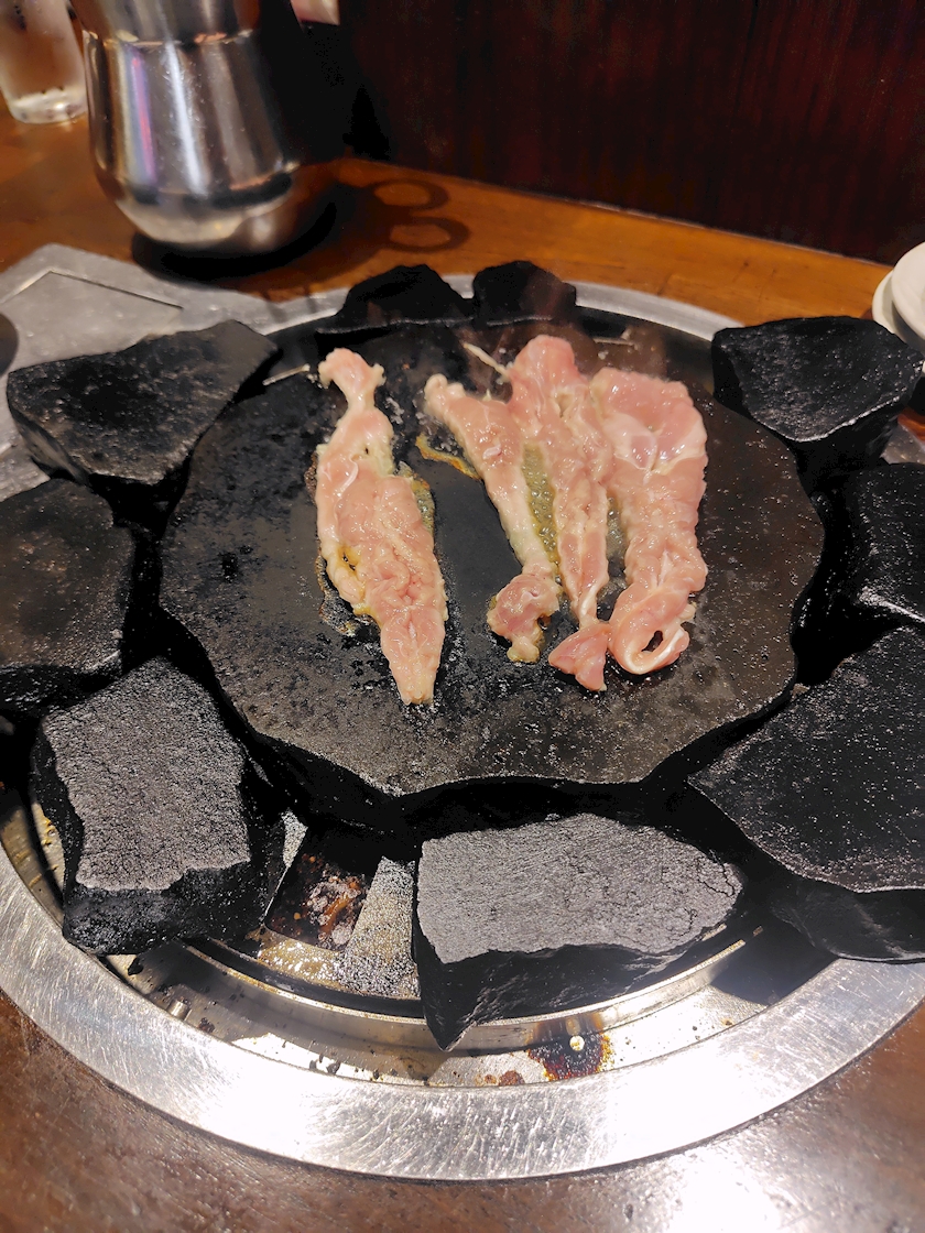溶岩石の上で鶏肉とか焼いて