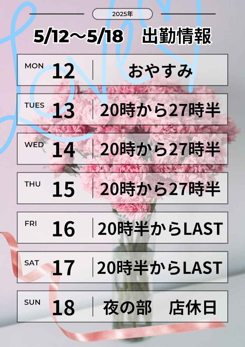 - 🩷あきの出勤情報🩷(5月12日から5月18日)