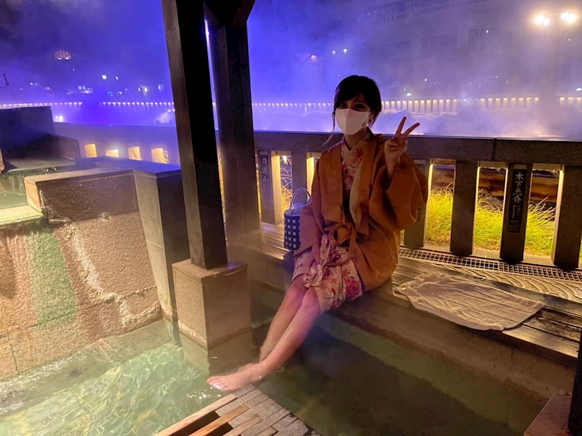 夜の湯畑で足湯に入りました🥰
