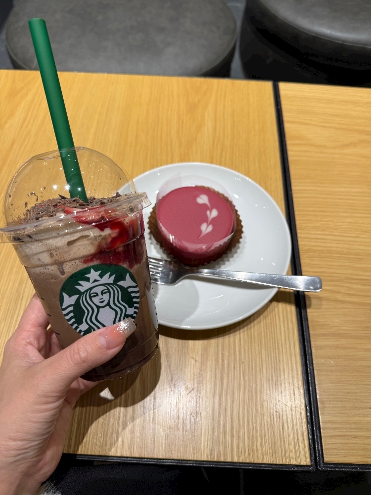 カカオフラペチーノとルビーケーキ♥️