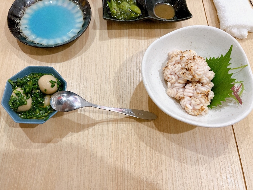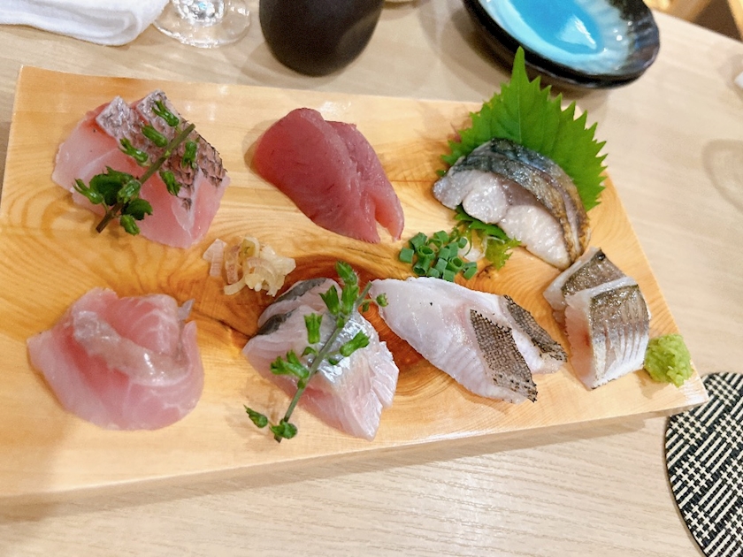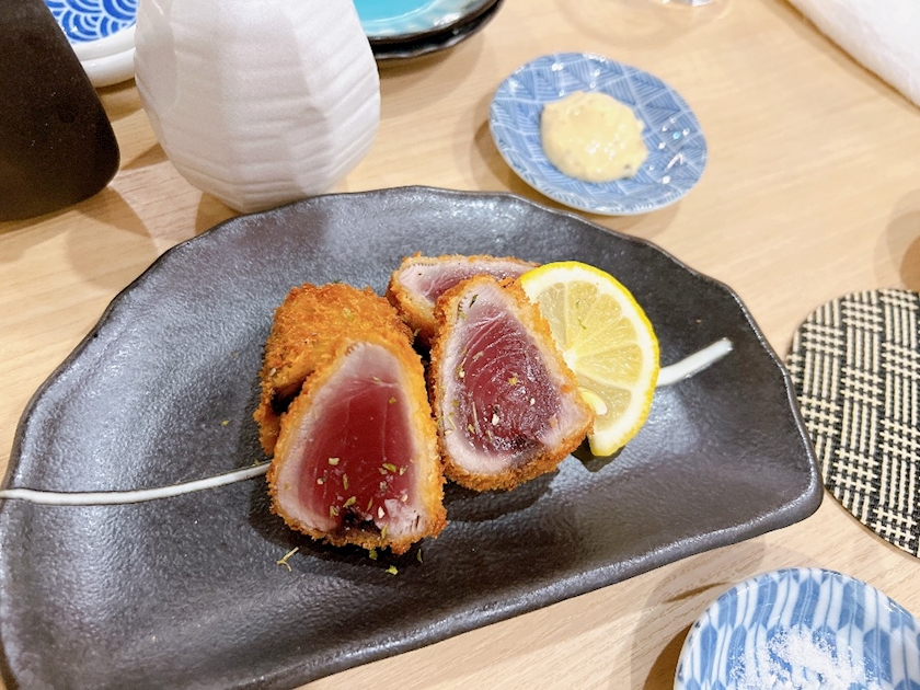 鰹のレアカツと白子炙り、ホッケの刺身が
