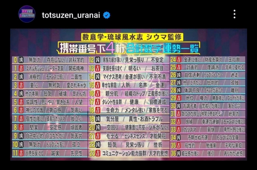 携帯番号の下4桁の合計数で