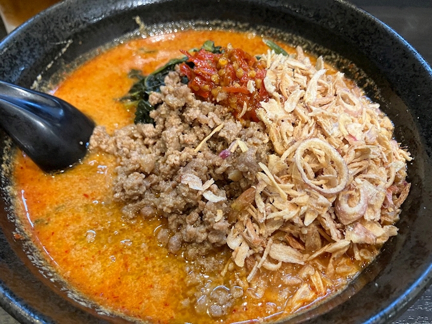 カリカリの食感と、ネギの風味が最強に坦々麺とマッチするの☝️