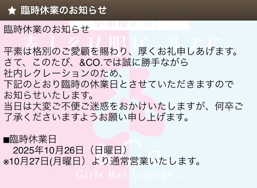 26日(日)臨時休業‼️‼️😅 - みさ - Girls Bar Lounge & Co.・アンドコー - 小田原駅東口のガールズバー