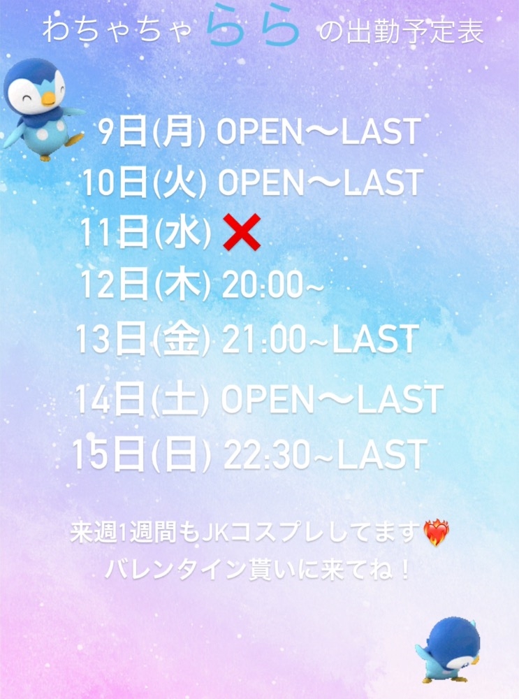 今週の出勤予定はこんな感じです!