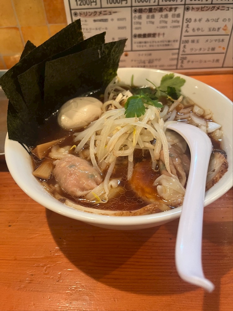 ワンタン、チャーシュー、煮卵と具が満テンでした。