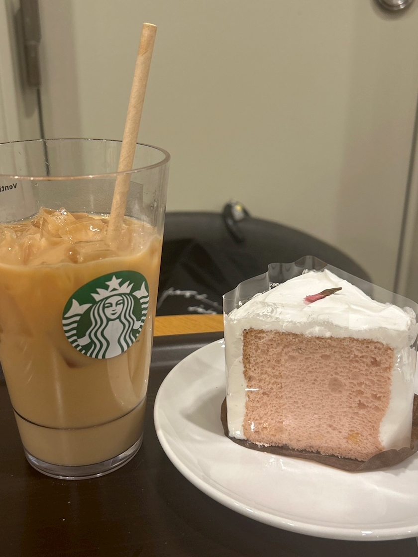大大大好きなほうじ茶クラシックティーラテと桜のシフォンケーキ🌸🤍