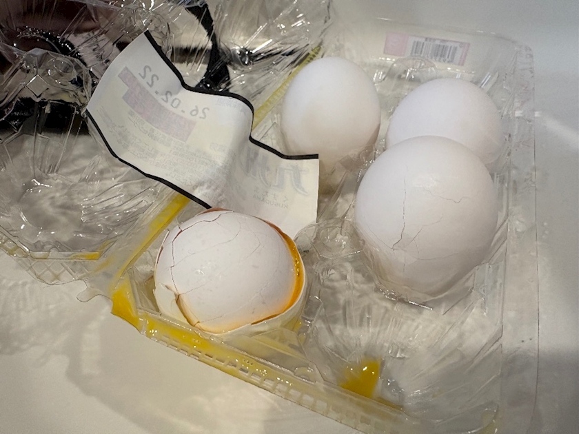 卵が入ってるエコバッグをね、、落としたんですよ、、