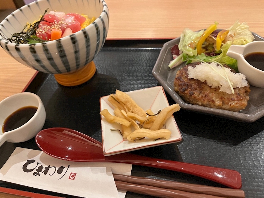 ハンバーグと海鮮丼の組み合わせ