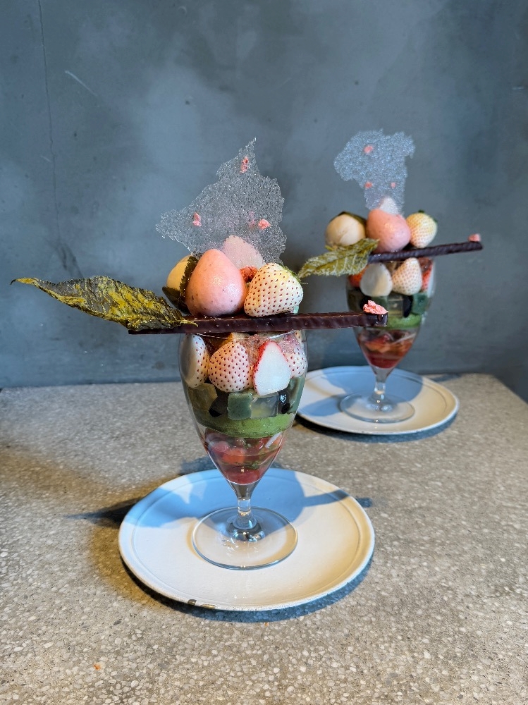 苺と山菜のマリネ、蓬ジェラート、ゆずガナッシュ、