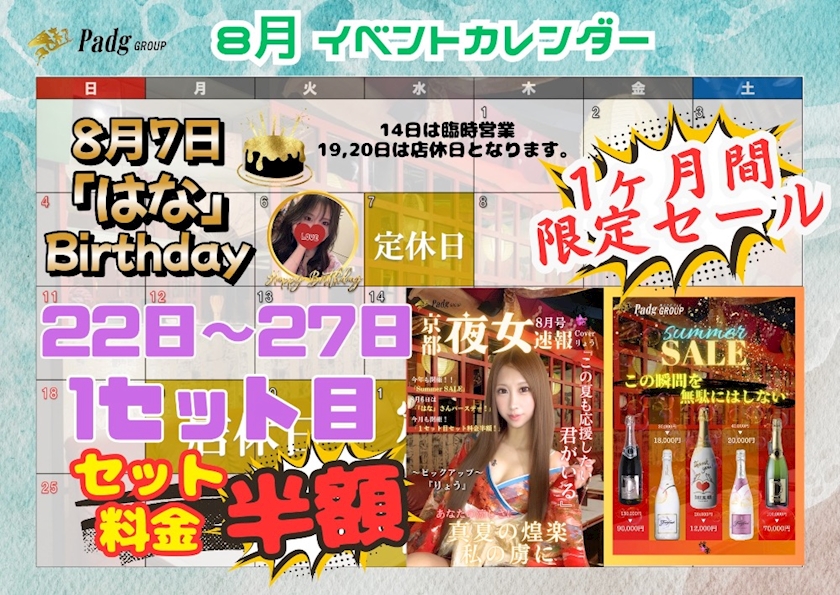 8月カレンダー - 山田 あいら - くらぶ煌楽-KOURAKU-・こうらく - 木屋町のキャバクラ