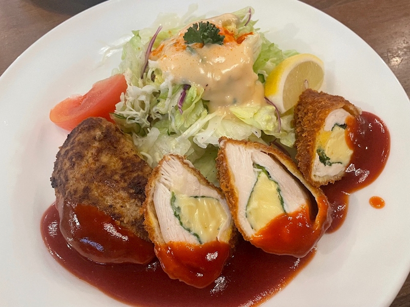 たっぷりのサラダとハンバーグとチーズチキンカツ!