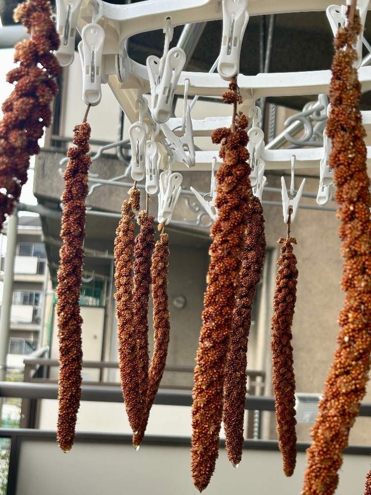 届いた赤粟穂を洗って干したり