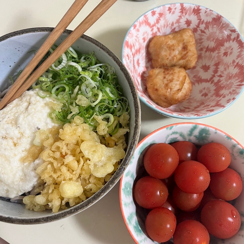 とろろ蕎麦と唐揚げとプチトマト