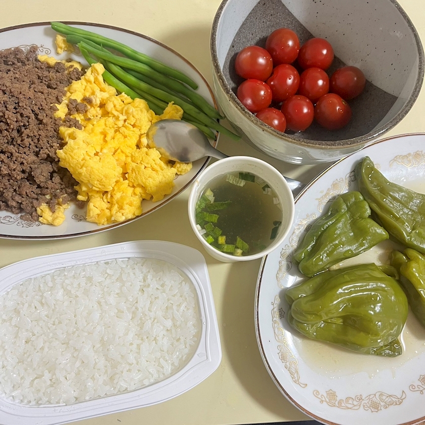 3色丼とピーマンのおひたしとプチトマトと味噌汁🤍