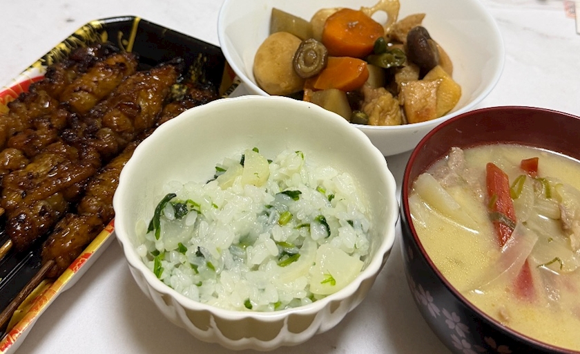 あまり物の豚汁と惣菜のぐるぐる巻き🐔
