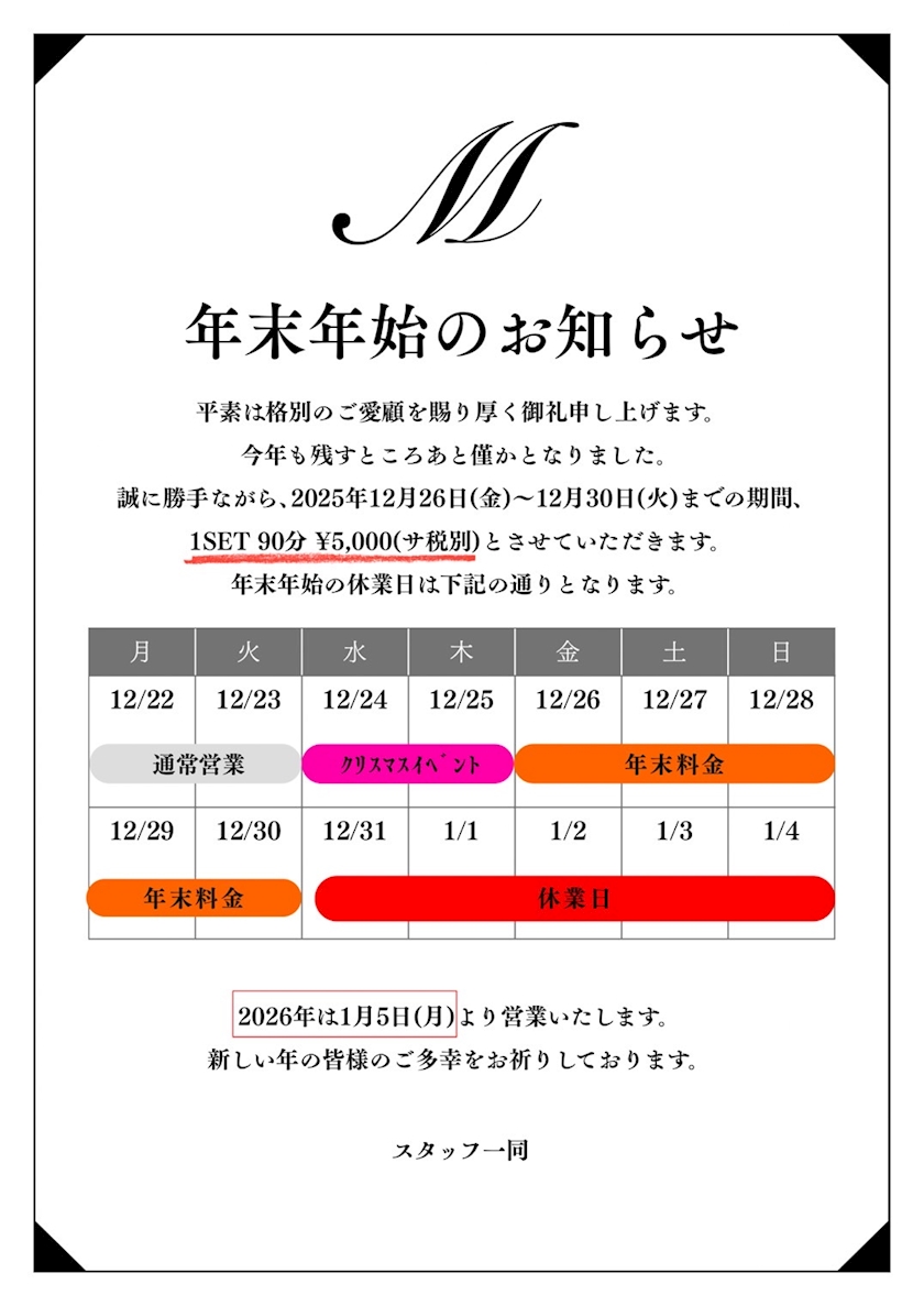 26日からは年末料金になります