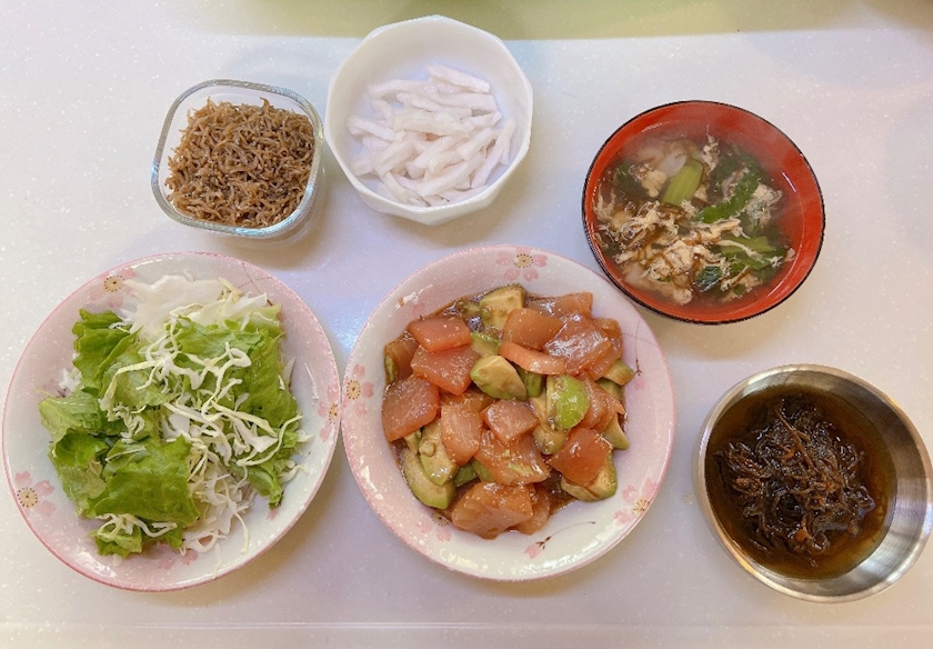おかん特製のちりめん山椒、昨日仕込んだかぶの漬物、もずくと椎茸と小松菜のお吸い物、サラダ、マグロとアボカドの和え物、自家製もずく酢🤤