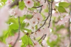 新緑と薄ピンクの葉桜も