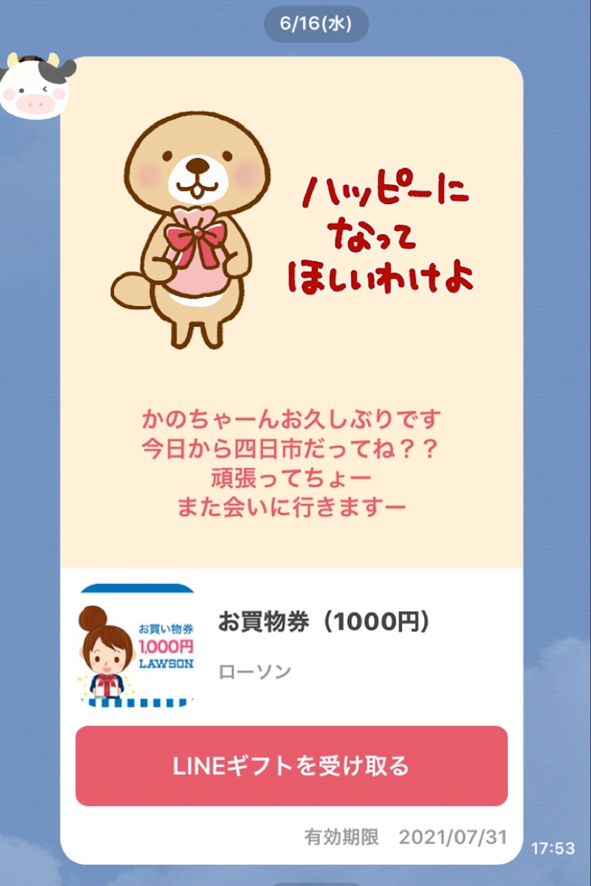 移店初日にLINEギフト送ってくれて