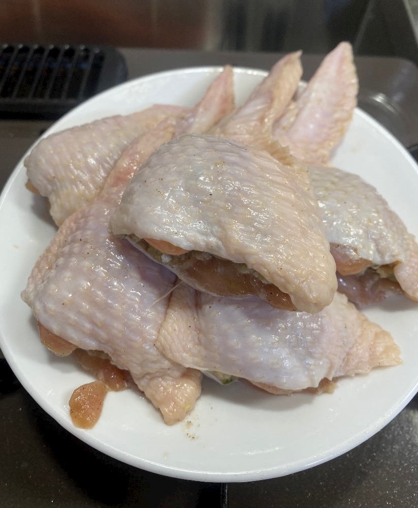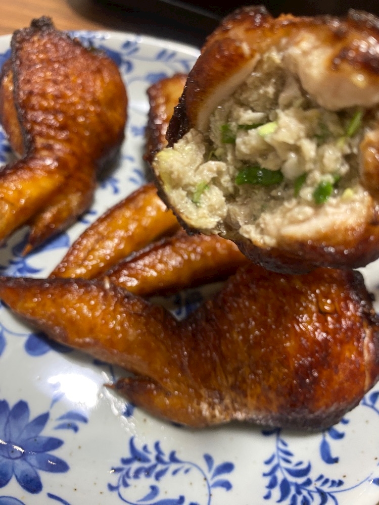 骨を取って調味料に漬け込んだ手羽先に詰め込んで〜