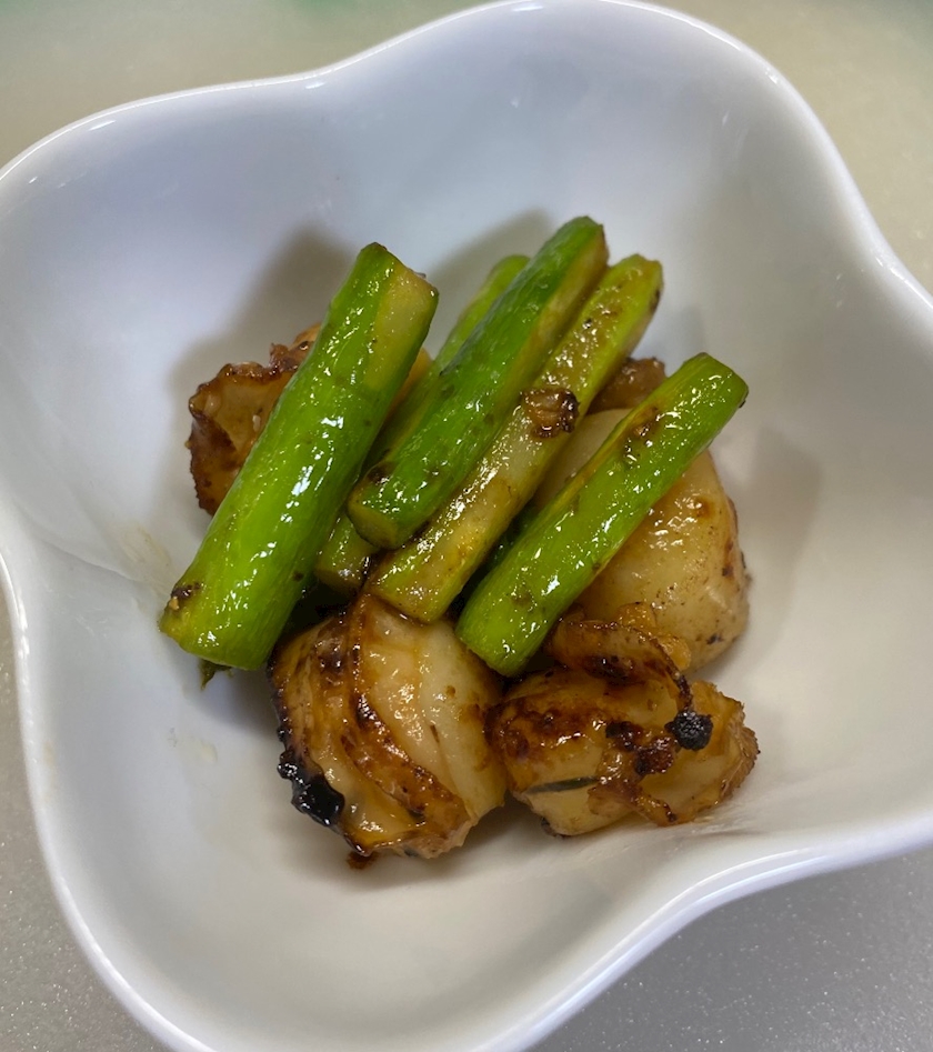 ホタテとアスパラのガリバタ醤油炒めに