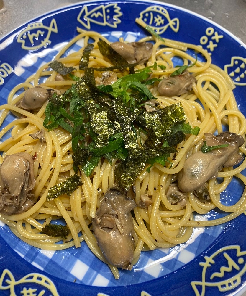 牡蠣のオイル漬けのパスタを食べて