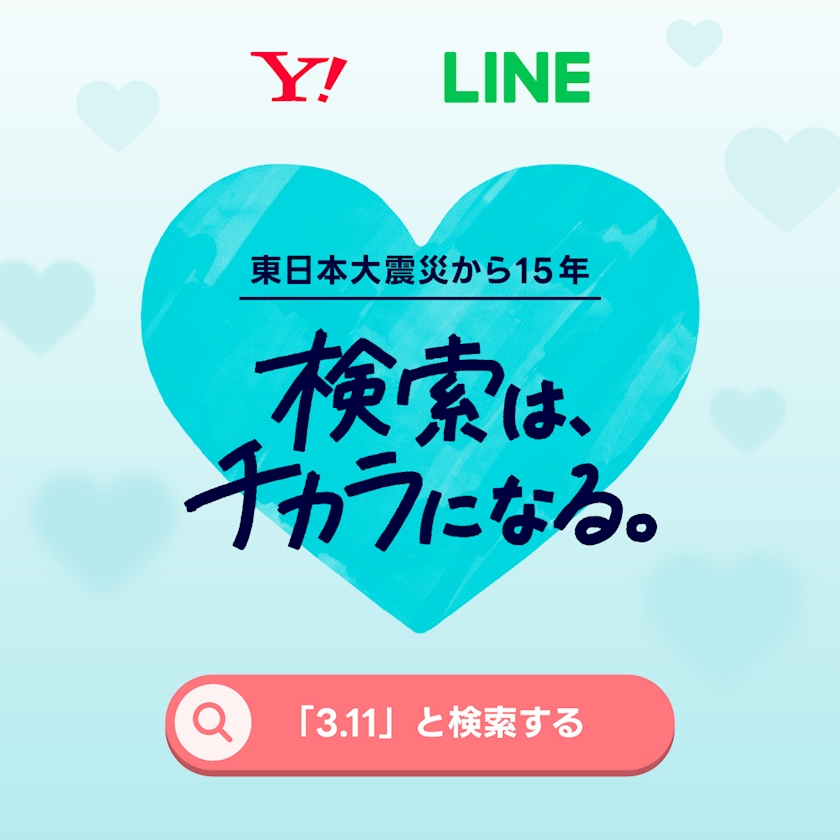 3月11日にヤフーやLINEで「3.11」と検索すると、LINEヤフーから、おひとりにつき10円が、東北や能登の支援のために寄付されます
