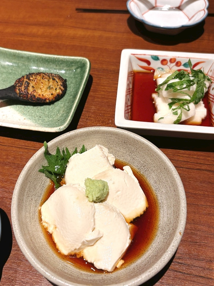 そば豆腐🤍焼き味噌🧡長芋短冊🤍日本酒も🍶