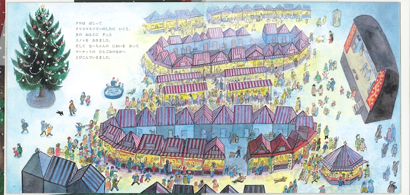クリスマスの飾りや、お父さんの好きなはちみつの甘いお酒、焼き栗などを買ったなーちゃんでしたが、なんと大切なスノゥを落としてしまうのです。でも、なーちゃんは気づかずに行ってしまいました。それを見ていたクロは、スノゥをなーちゃんに届けるため、クリスマスマーケットの中を駆け回り、スノゥを届ける大冒険へ出かけます。