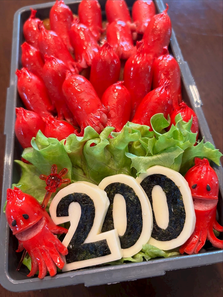 ほかにも、『200』の数字をかたどった食材で、デコレーションしてあったり、タコさんウインナーの顔を作ったりと、かなり手間がかかっているように見受けられます。