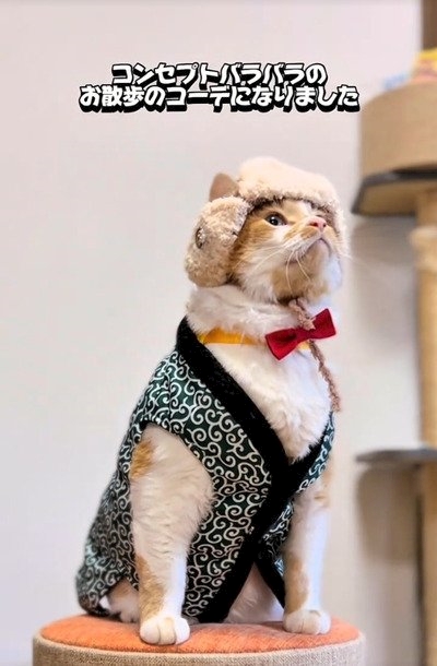 「ちゃんちゃんこ、可愛いね」元保護猫ちゃん、ちょっぴりカオスなお散歩スタイルが話題に