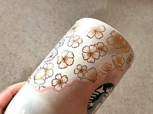 ゴールドで表現された桜の葉が散りばめられており、それに合わせてボトルの底部も同じくゴールド。高級感のある上品なデザインです。スターバックスのロゴはエンボス加工で表現されており、主張しすぎない控えめなデザインが桜の模様を引き立てています。