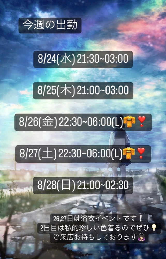 本日8/25(木)21:00~03:00いてます❕