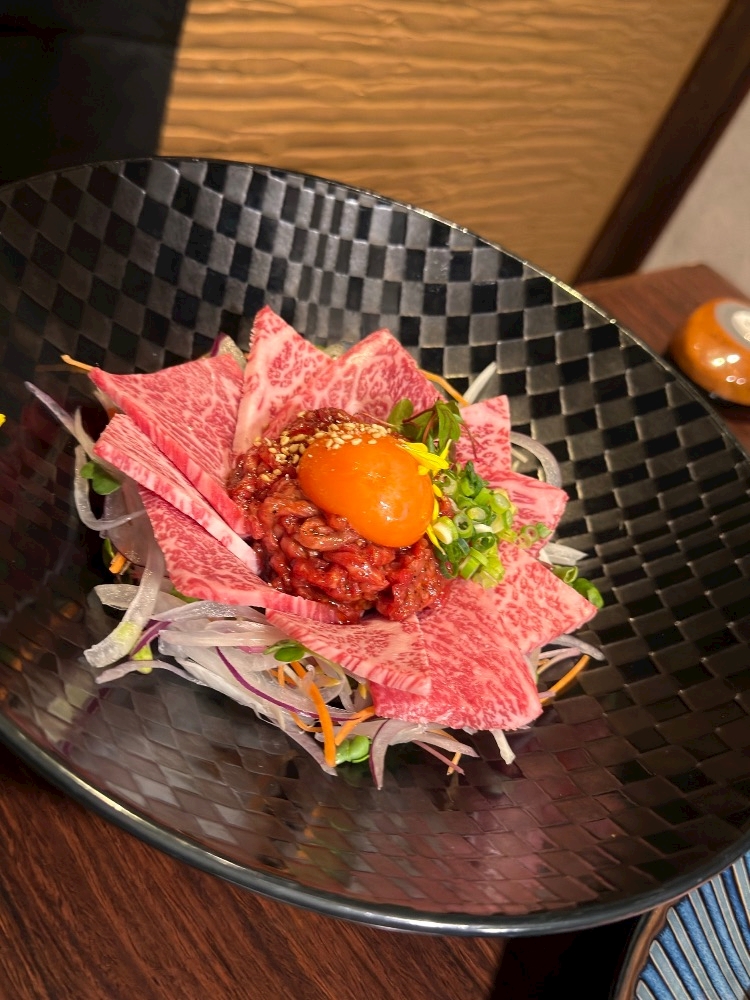 生肉でユッケを包んで食べるという