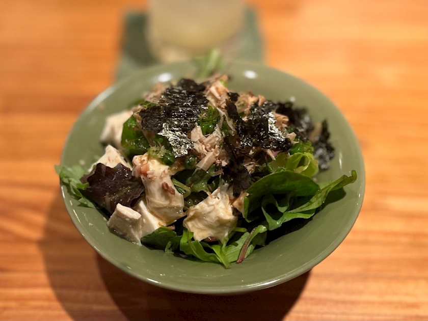 ふたりで食べるために、取り分けた状態で配膳いただきました。お豆腐と湯葉が入った和風なサラダ。