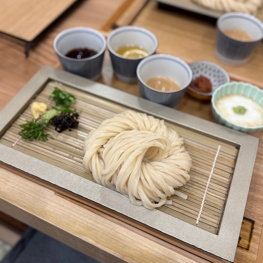 ヒロキが追加注文したもの紛れているので分かりにくい画像になってしまっていますが、3種のつゆと5種の薬味の添えられた冷うどんです。