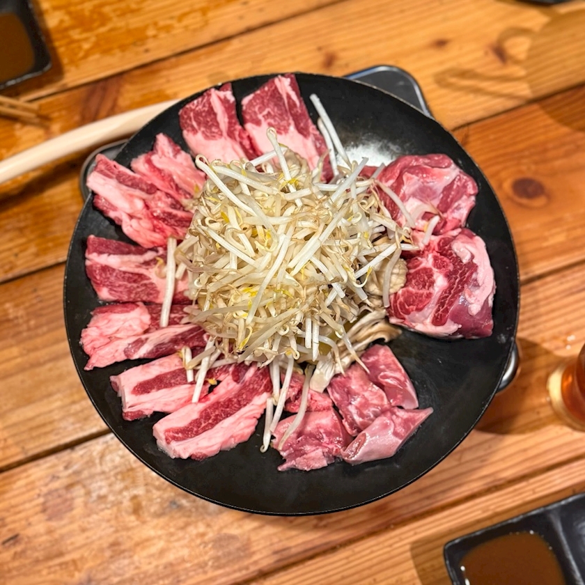 大ぶりにカットされた肩ロースは、えいじんならではの迫力。ゴロゴロとした塊のまま鉄板の上にのった状態で配膳され、従業員が部位の案内をしながらカットしつつ焼き進めてくれます。