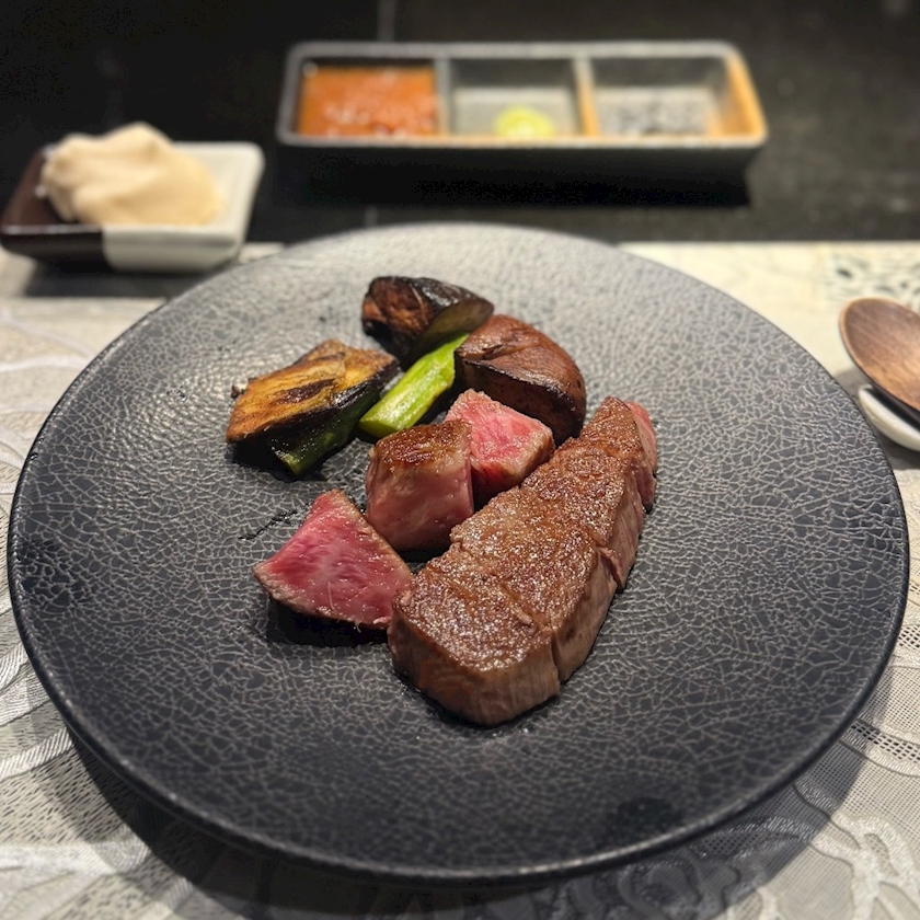 赤身肉の焼きはレアを指定。繊維がきれいに整っていて、見た目以上の繊細なほどけ感を楽しめるよいお肉です。合わせる薬味類は、炭塩とわさびが特にお気に入り。肉の香りを引き立てつつも脂疲れを感じにくくしてくれる優秀な面々です。泡醤油やステーキソースもついてくるので、好みによってはそちらも併用することで味の幅を増やすことができる。