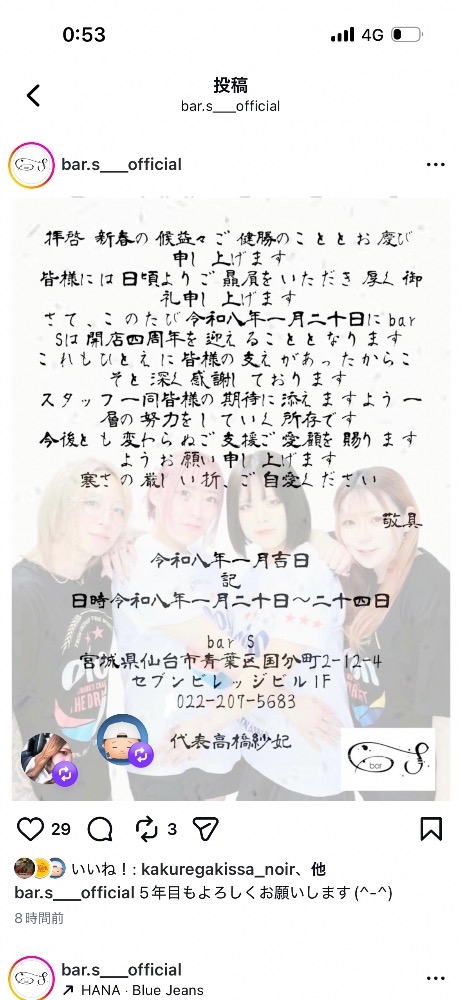 4年の間、bar Sというお店に関わってくれた方達のおかげで今があります。これからもみんなでバトン渡していこうねって気持ちです。