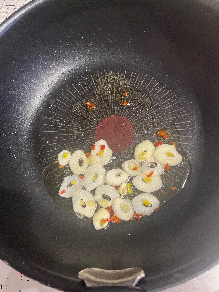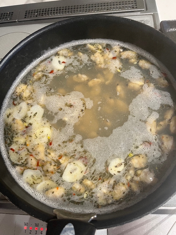 まずはオリーブオイルでニンニク🧄と鷹の爪を炒めて香りをだす