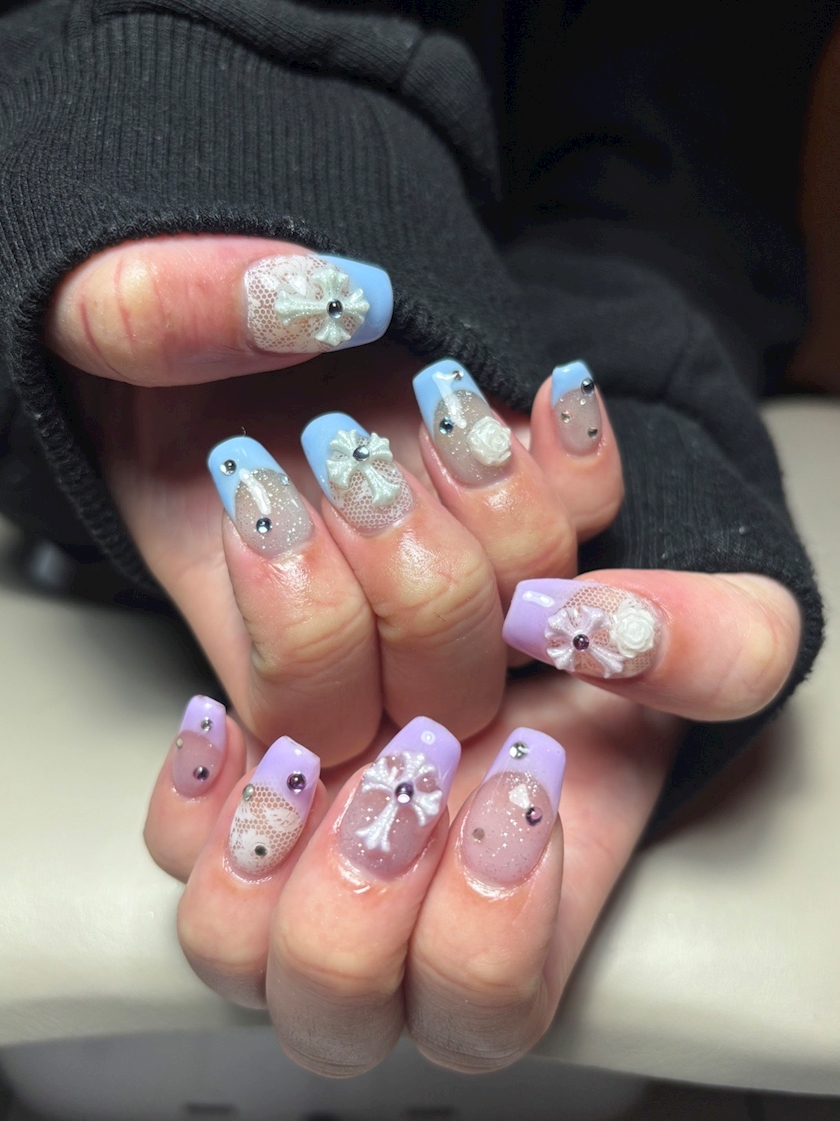 キラキラ、シルバー水色紫、Y2K、花、レース
