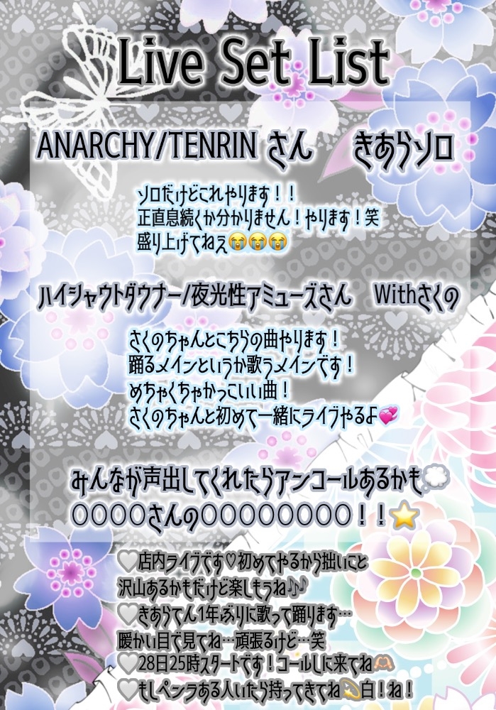 割れめ初の生誕祭❕顔出しにだけくるもよし⭕️ライブ見に来て騒ぐのもよし⭕️きあらてんの緊張してる顔をいじりに来るでもよし⭕️ぜひ足運んで欲しいな!