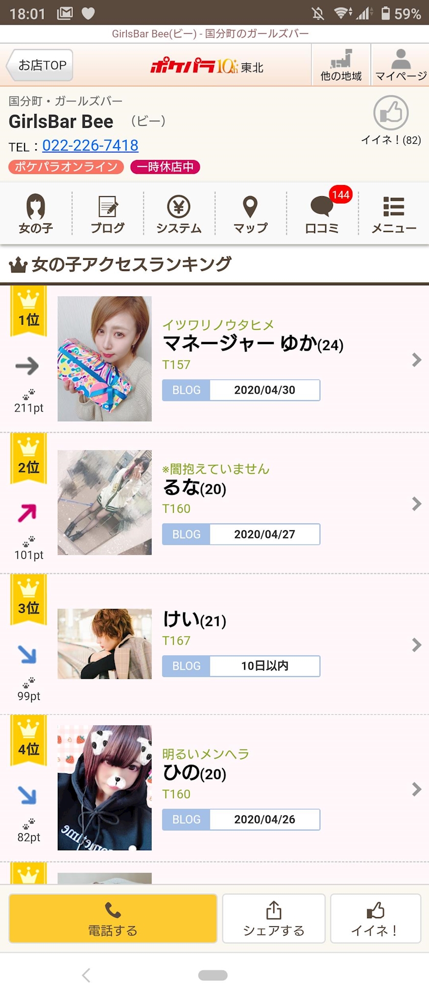 やっぴ⸜(*´꒳`*)⸝ - るな - GirlsBar Bee・ガールズバービー - 国分町のガールズバー