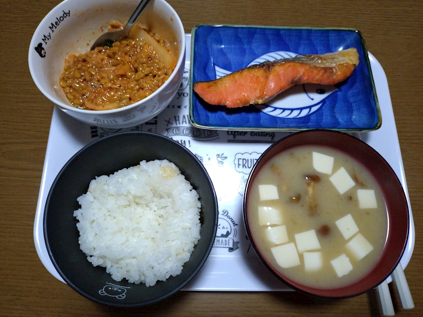 ご飯+なめこ味噌汁+キムチ納豆+鮭