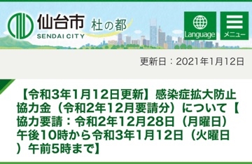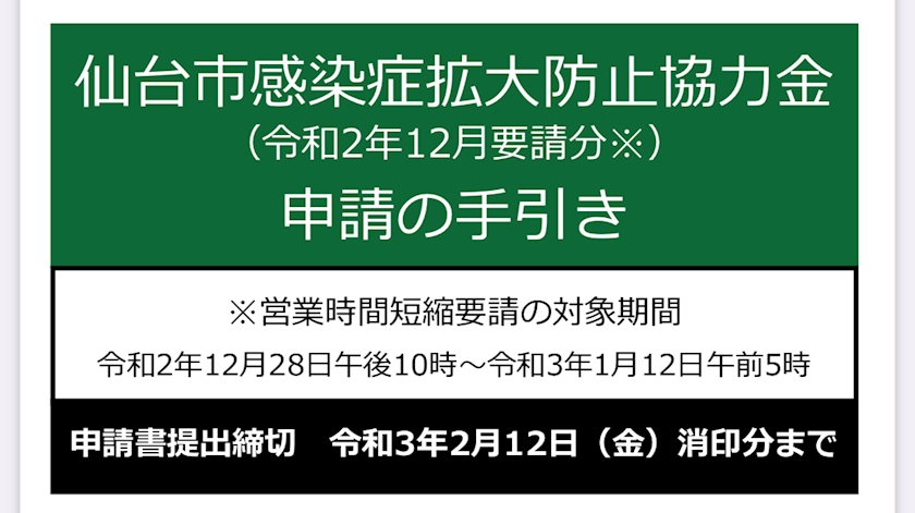 - 仙台市感染症防止協力金の申請が始まりました!