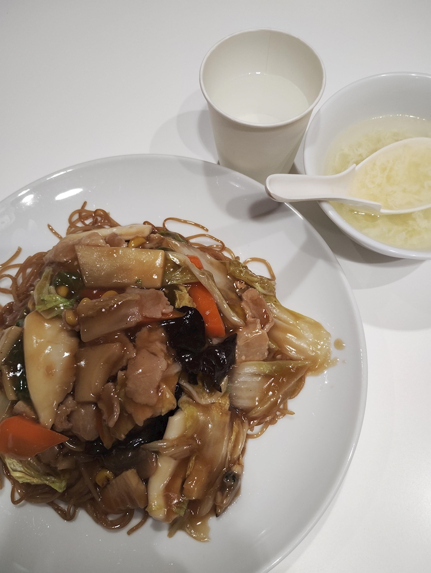 五目焼きそば、マックのメロンソーダ、
